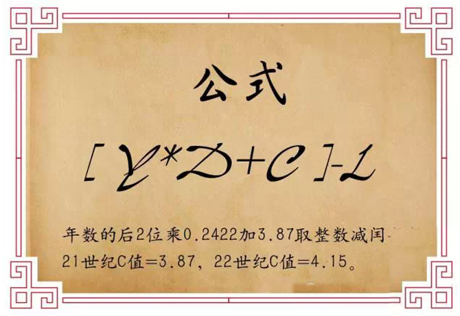 公式解讀:年數(shù)的后2位乘0.2422加3.87取整數(shù)減閏年數(shù)。21世紀(jì)C值=3.87,22世紀(jì)C值=4.15。